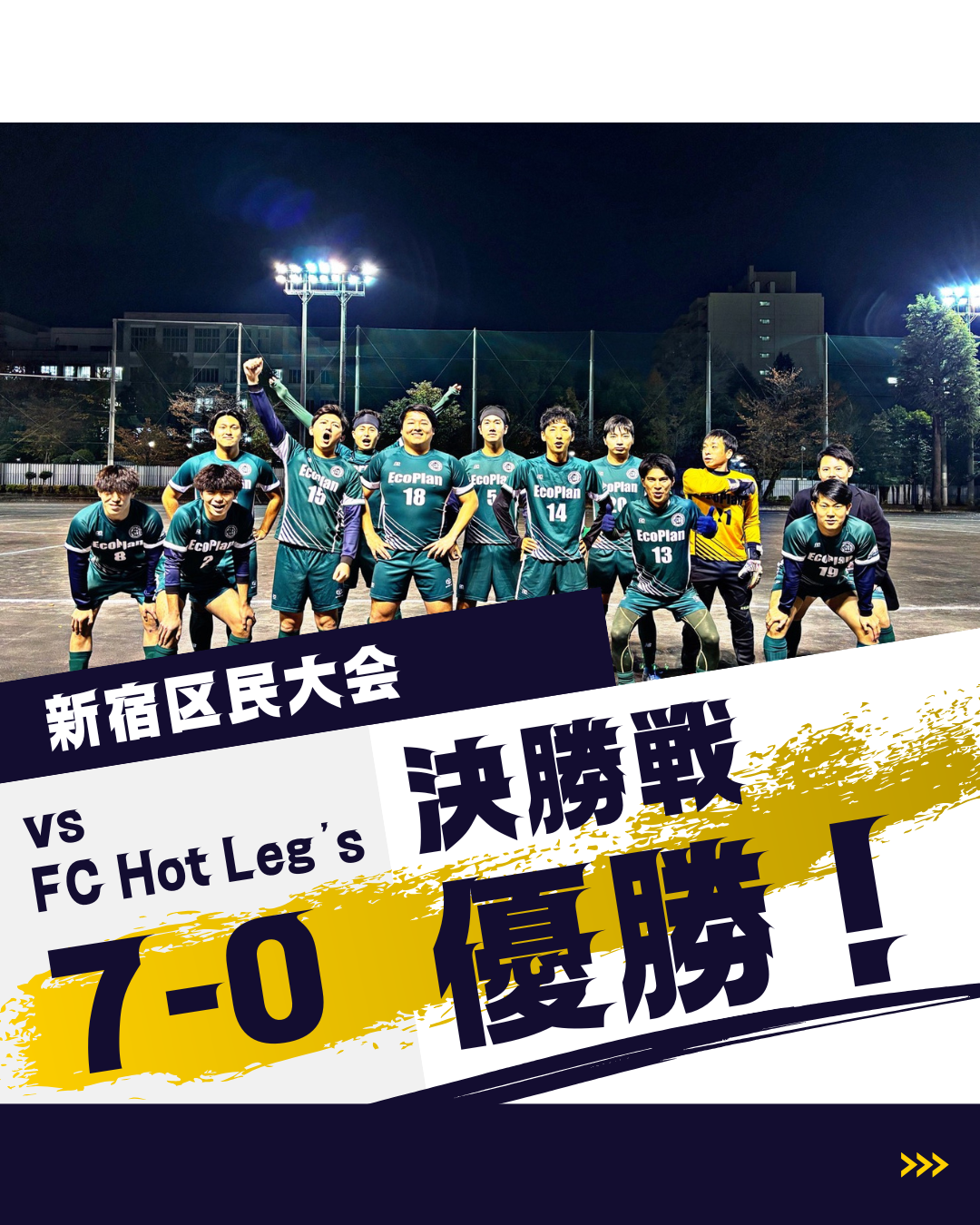 11月19日(水)新宿区民大会トーナメントの決勝戦が行われました。【2部リーグ】トップチームのFC Hot Leg'sと対戦し、7-0で快勝。FCエコ・プラン初優勝を飾りました。
