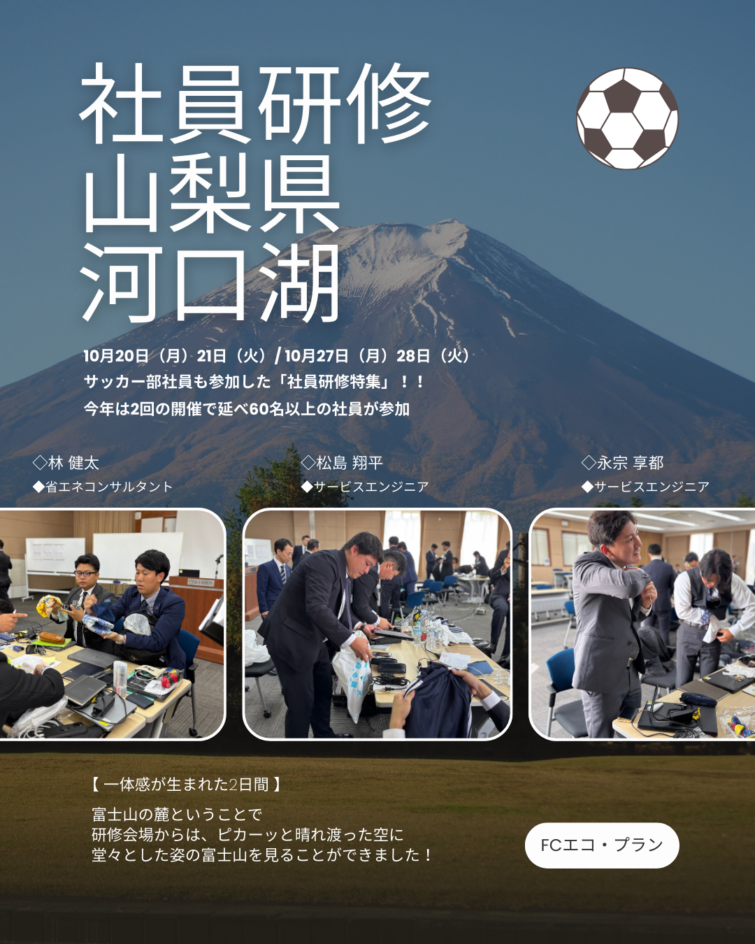 この度、株式会社エコ・プランでは10月20日(月)21日(火)、27日(月)28日(火)2回に分けて社員研修を実施しました。今回の研修では、サッカー部に所属する松島翔平(サービスエンジニア)、永宗享都(サービスエンジニア)、林健太(省エネコンサルタント)の計3名が参加しました。